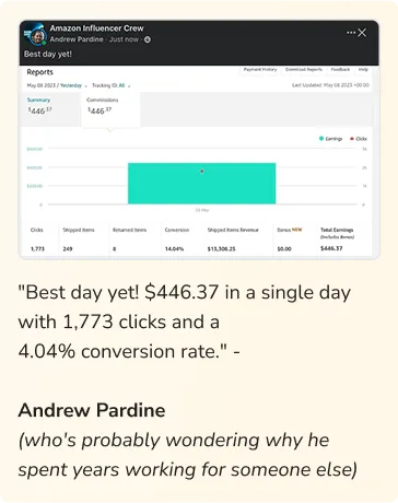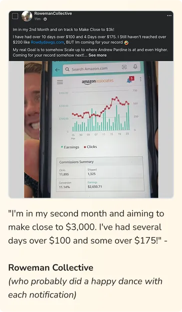 Disclaimer: The testimonials and examples used are exceptional results and are not intended to be a guarantee that you or others will achieve the same results. Individual results will vary and are dependent on your effort, business experience, knowledge, abilities, and level of implementation. This site is not a part of the Amazon website or Amazon.com Inc. Additionally, this site is NOT endorsed by Amazon in any way. Amazon is a trademark of Amazon.com, Inc. Also, we can't guarantee you won't become addicted to checking your commission notifications – that's on you.